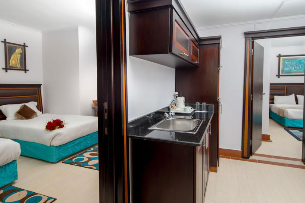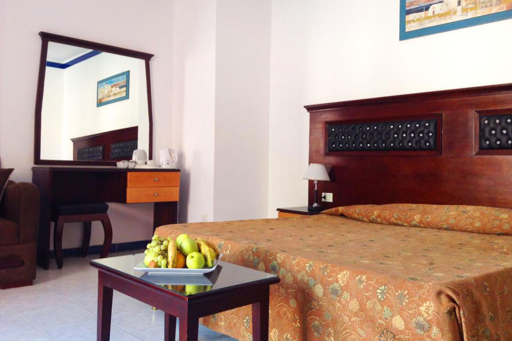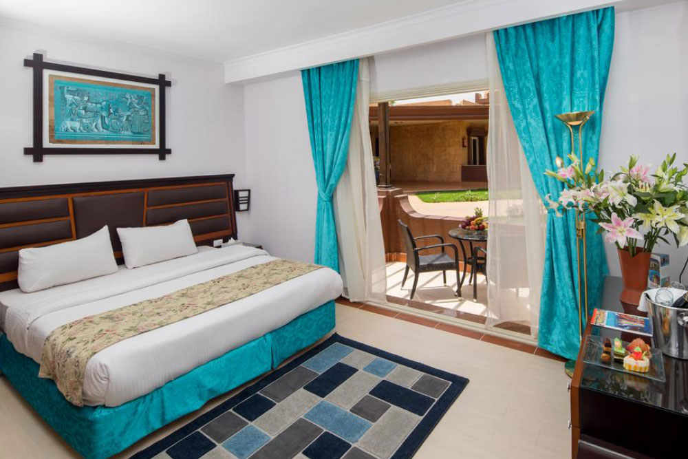 В просторных светлых номерах, оформленных в духе Древнего Египта, — балкон или терраса (не в каждом номере), ванная комната, кондиционер, спутниковое телевидение, телефон, мини-бар, сейф. Пол выложен плиткой. Доступны услуги прачечной, химчистки, глажки одежды, парикмахерской, няни.