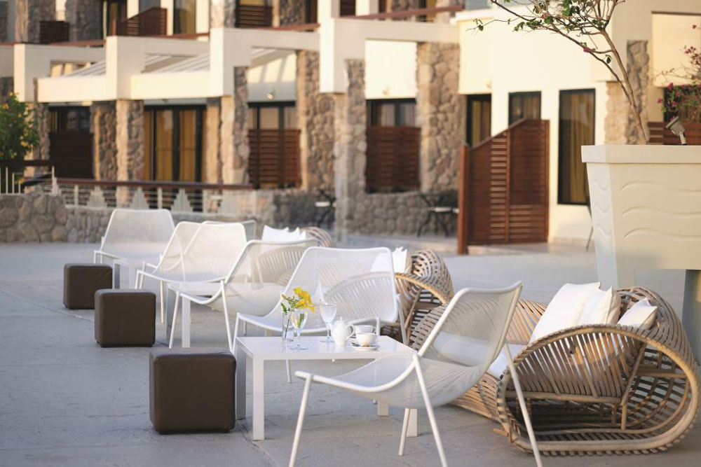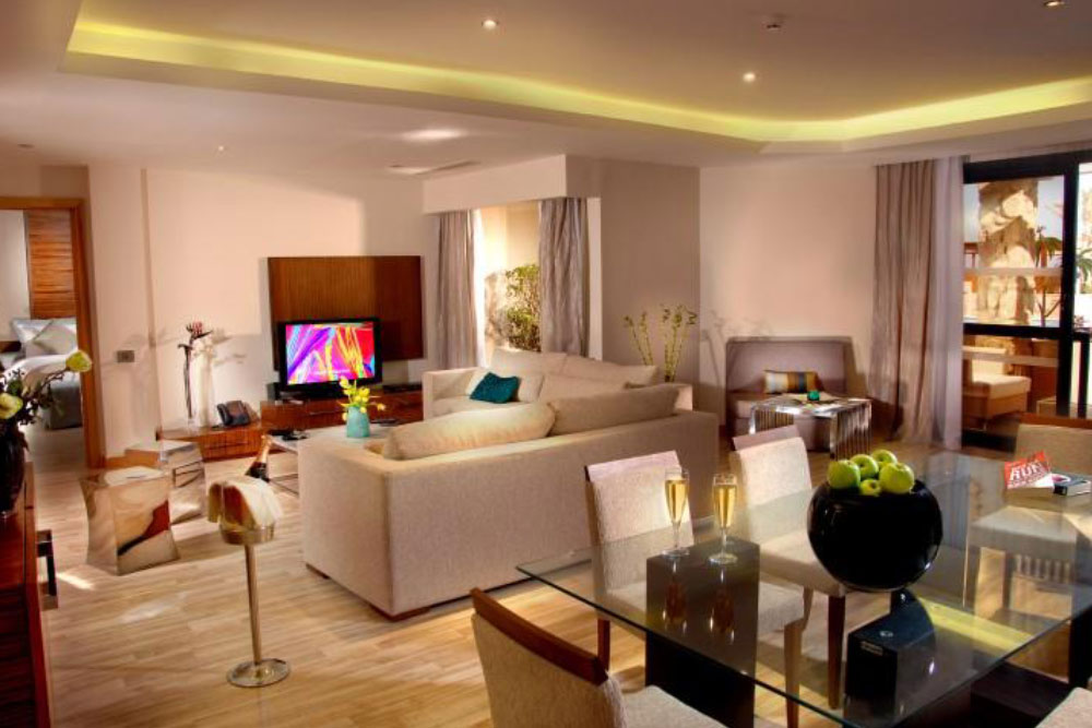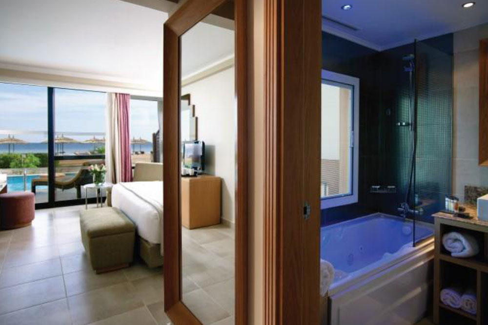 В номерах с видом на море или бассейн — балкон (или терраса), ванная комната (фен), кондиционер, спутниковое телевидение, радио, гостиная зона, мини-бар, телефон, док-станция для iPod, сейф, утюг с гладильной доской, набор для чая и кофе, напольные весы. Ванные комнаты оборудованы гидромассажной ванной, динамиками и LED-лампочками с меняющимся цветом.