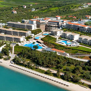 Курортный отель с пейзажным бассейном в форме лагуны расположен на берегу частного залива в городке Неа-Моуданья. Из номеров открывается вид на море и горы.