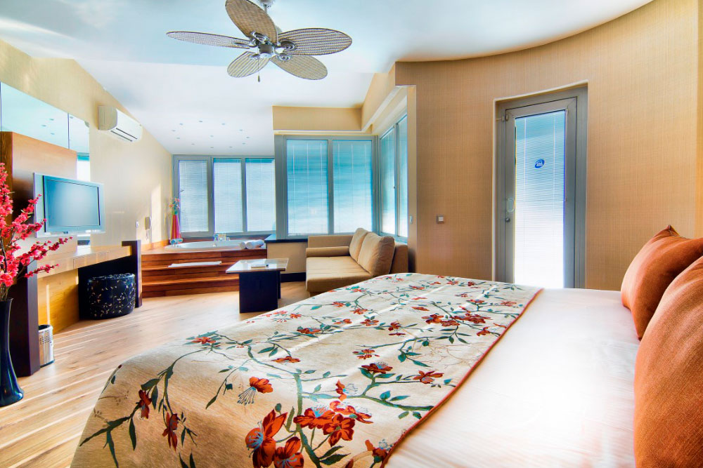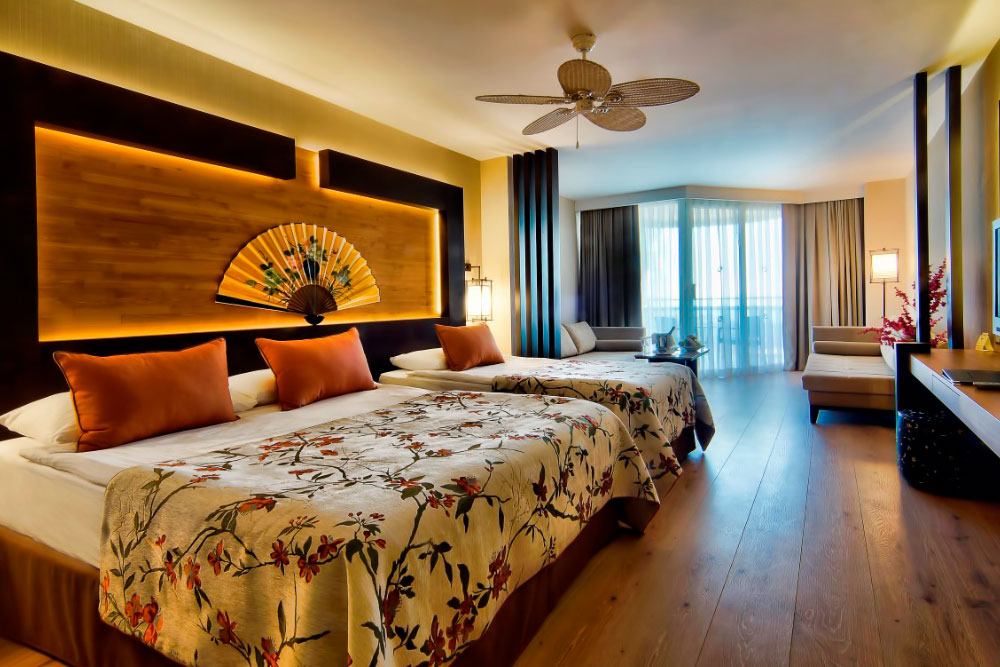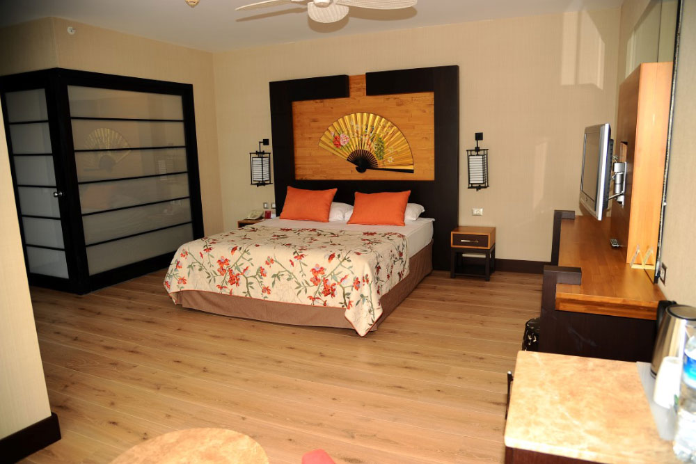 В уютных номерах, обставленных современной мебелью с элементами турецкого колорита, — балкон, кондиционер, просторная гостиная зона, ванная комната (полотенца, фен), спутниковое телевидение, мини-бар, сейф, интернет, телефон; ковровое покрытие. Доступны услуги няни, врача, фотографа, парикмахерской, химчистки, прачечной, глажки одежды, чистки обуви.