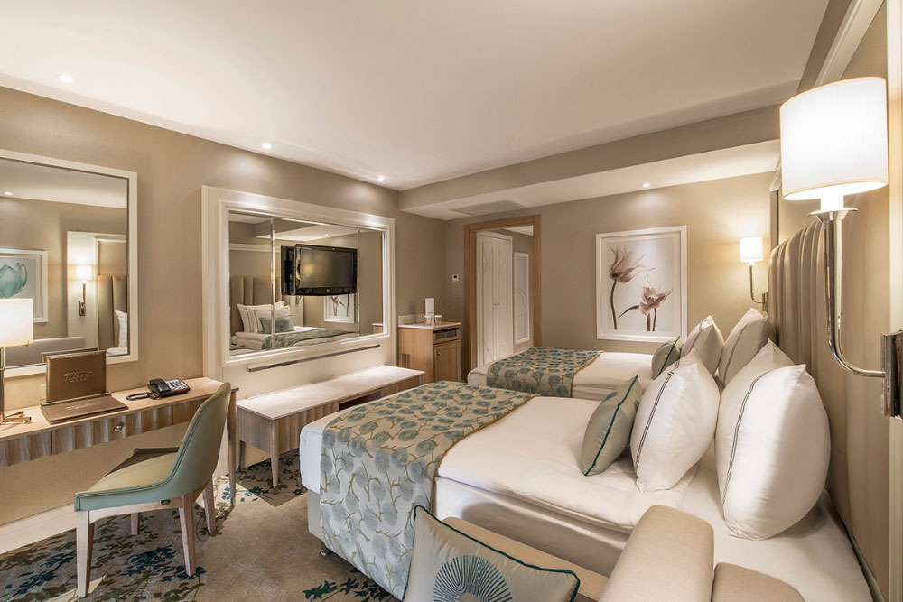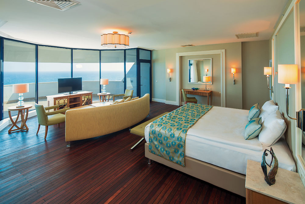 В номерах — большие окна с видом на море, балкон (или терраса), кондиционер, спутниковое телевидение, ванная комната (фен), телефон, интернет, мини-бар, сейф. Доступны услуги няни, врача, фотографа, парикмахерской, химчистки, прачечной, глажки одежды.